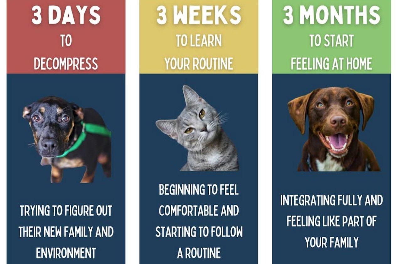The 3-3-3 Rule outlines three key phases of adjustment during a rescue pet’s first days, weeks, and months in their new home: