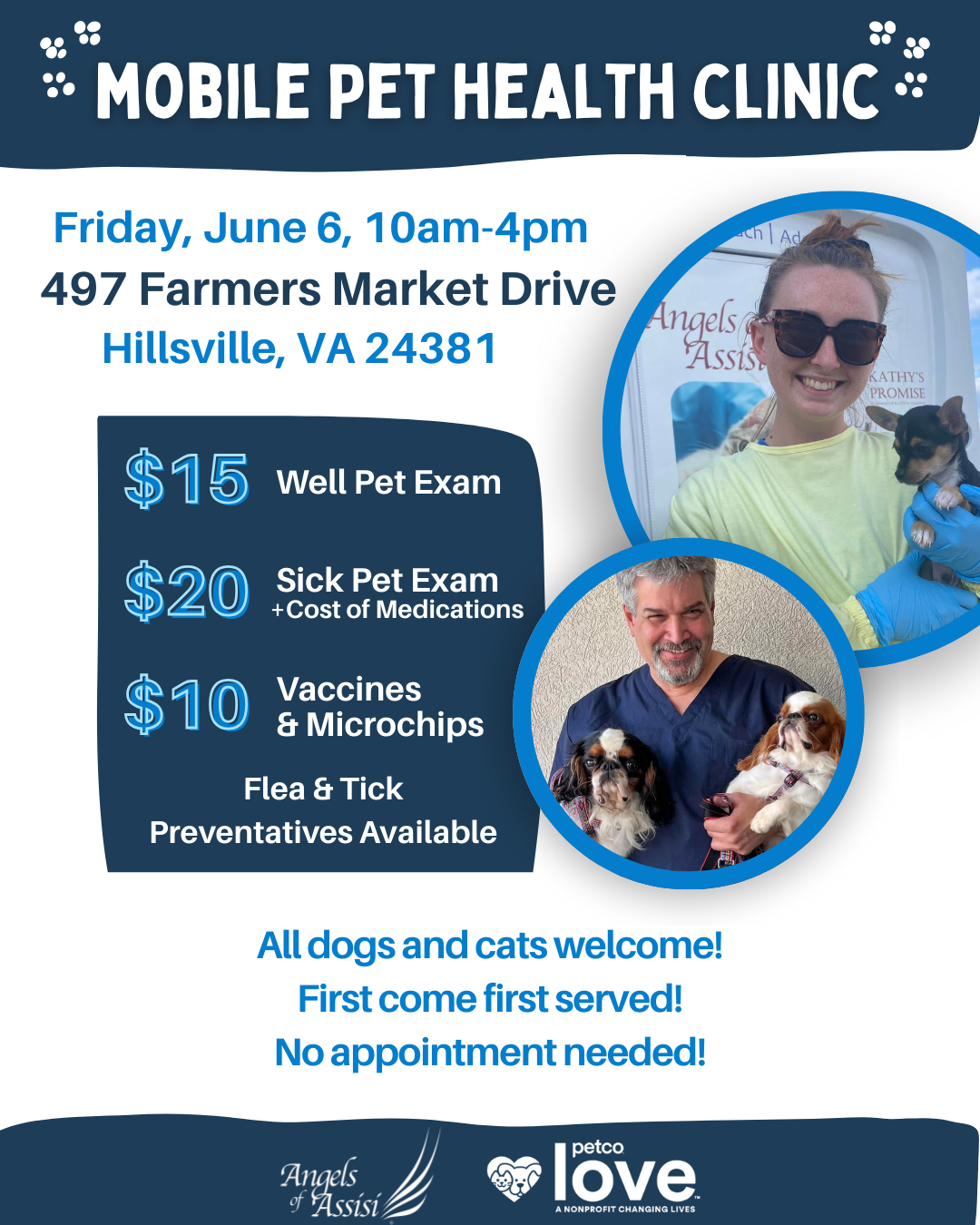 Angels of Assisi will be hosting a Mobile Pet Health Clinic in Hillsville, VA on Friday, June 6 from 10am-4pm! The event will be held at the Southwest Virginia Market/Brady’s Farm Market at 497 Farmers Market Drive.
